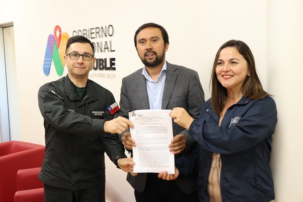 El director regional de Gendarmería Ñuble, coronel Juan Navarrete Gamboa junto a Seremi de Justicia y DDHH, Elizabeth Riquelme Donoso, firmaron convenio de comodato con el Gobernador, Óscar Crisóstomo Llanos, que permitirá próximamente ejecutar la instalación de moderna tecnología en beneficio de la seguridad del recién inaugurado penal femenino de Bulnes.