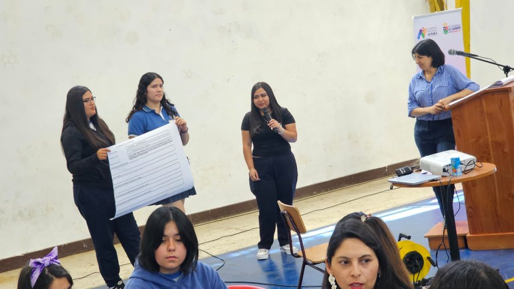 La profesional agradeció la convocatoria y disposición de las más de 170 estudiantes del liceo carmelino congregadas en el gimnasio municipal, centrado en lograr un diagnóstico participativo, cuyo objetivo principal fue que las adolescentes identificaran problemáticas asociadas a inequidades de género presentes en el establecimiento y sus entornos sociales, con ejemplos tales como el bullying, el ciberbullying, violencia psicológica, relacional, entre otras, y cuya información fue necesaria para generar planes de acción para enfrentarlas y ejecutarse durante el próximo año.