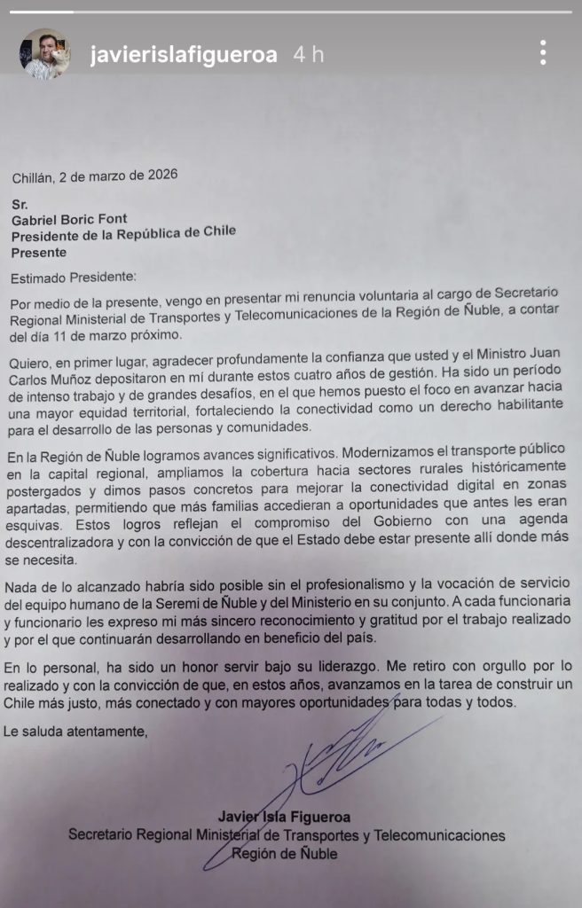 El actual Seremi de Transportes y Telecomunicaciones de la Región de Ñuble, Javier Isla Figueroa, presentó su renuncia voluntaria al cargo mediante una carta dirigida al Presidente de la República, Gabriel Boric Font. La dimisión, fechada para este lunes 02 de marzo de 2026 y difundida por sus redes sociales (Instagram), será efectiva a partir del próximo 11 de marzo. En el documento, Isla agradece la confianza depositada en él durante cuatro años de gestión y subraya el honor que significó servir bajo el liderazgo del mandatario.