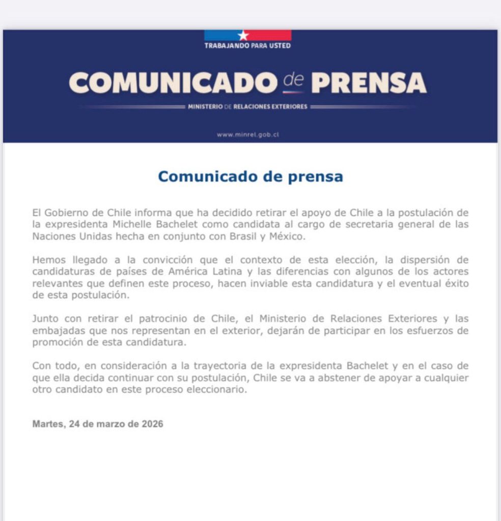 El Ministerio de Relaciones Exteriores informó este martes 24 de marzo que Chile decidió retirar el apoyo a la candidatura de la expresidenta Michelle Bachelet para el cargo de secretaria general de la Organización de Naciones Unidas (ONU). La postulación había sido presentada en conjunto con Brasil y México.