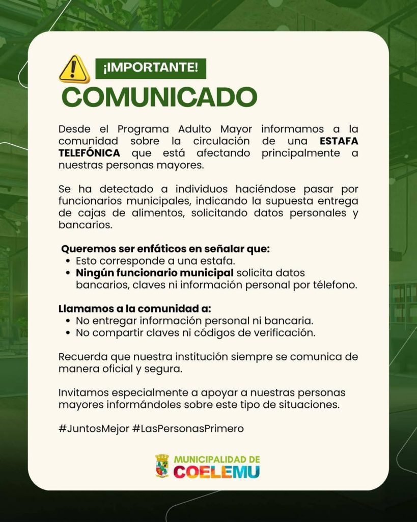 De acuerdo con la información entregada por el Programa Adulto Mayor de Coelemu, este grupo etario es el principal blanco de los delincuentes. Los estafadores solicitan no solo datos personales, sino también claves bancarias y códigos de verificación, argumentando que son requisitos necesarios para la entrega de cajas de alimentos. Ante esto, las autoridades han sido enfáticas en señalar que ningún funcionario público está autorizado para pedir este tipo de información confidencial de forma remota.