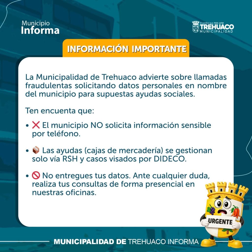 Por su parte, el municipio de Trehuaco recordó a la comunidad que la gestión de ayudas materiales, como las cajas de mercadería, se realiza exclusivamente a través de los canales oficiales. Estos procesos dependen del Registro Social de Hogares (RSH) y deben ser visados directamente por la Dirección de Desarrollo Comunitario (DIDECO). Cualquier solicitud de datos fuera de estos protocolos debe ser considerada de inmediato como un intento de fraude.
